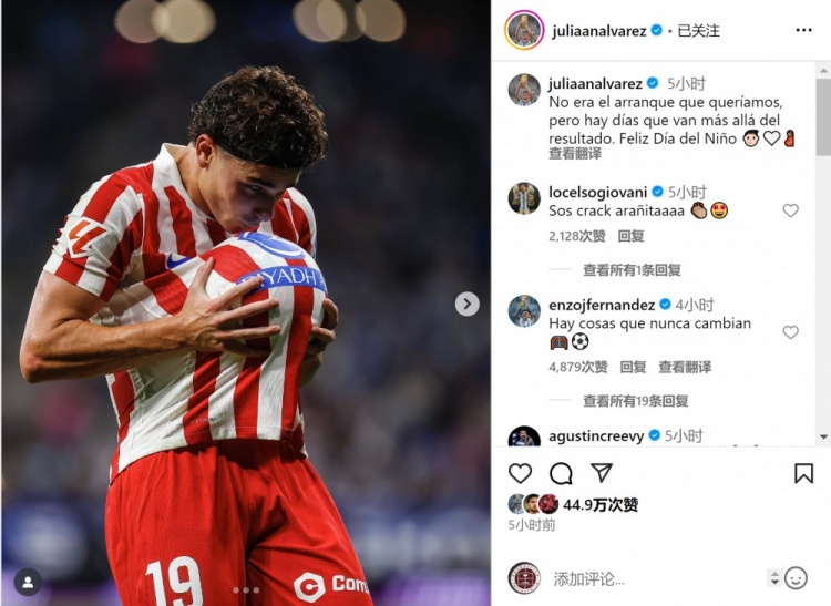 阿尔瓦雷斯社媒晒出庆祝进球的照片,配文:“这不是我们想要的开局,但有一些日子超越了比赛结果,儿童节快乐!”